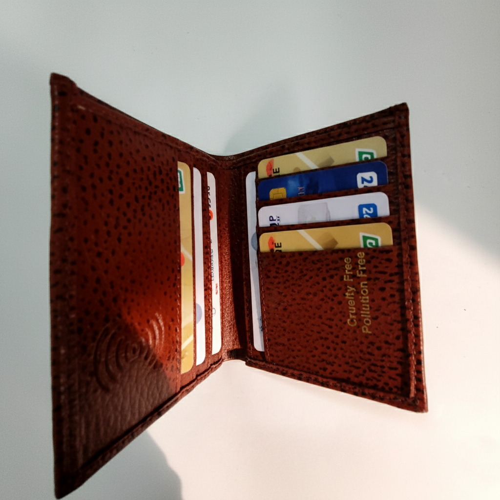 Crafted from Best quality plantbased Vegan material from Agriwaste. sleek and stylish. Gender neutral. Bifold card slot easily glides into your pockect Perfect. RFID protected.companion for every look.
